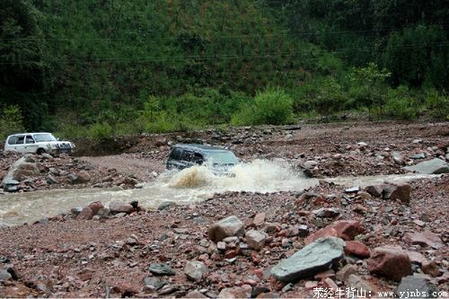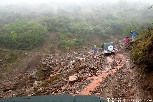 当地维持交通的工作人员告诉我们,山上在下雨,路况不好,考虑清楚再上去。开车的师傅都是该线路的老江湖,毫无畏惧,履行完相应的检查手续,继续上山。可刚到山脚下就出状况了,平时的小河沟今天却波涛汹涌,水量大增,众师傅只有加大油门就往河沟中冲,浪花溅起一米来高,那场景活脱脱是越野车的广告片!可惜最后还是有一辆车在湍急的河流中熄了火。大伙在雨中忙活了半天,最终两辆车一起使劲才把它拉上了岸。