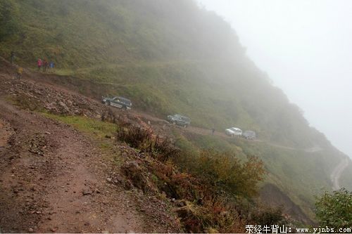 路过接待站时,虽然依然飞着雨雾,但阳光也出来了,给了我们一丝希望。可惜越往上,没了阳光,雾气越来越浓密,路更窄更陡,由于垫尾的两辆车常出状况,车队只得走走停停。天快黑时,终于到达了山顶。